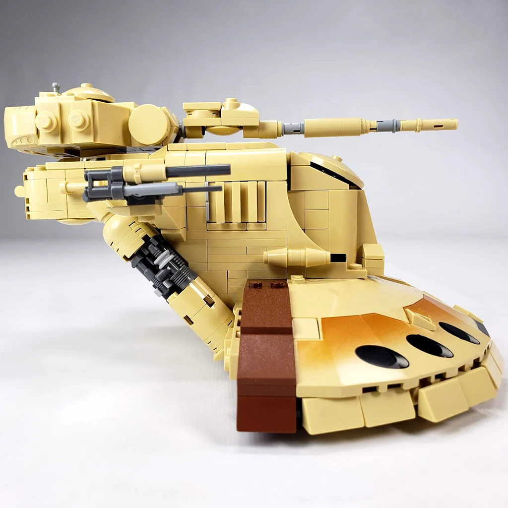 The AAT (Armored Assualt Tank) Battle Tank served as the primary infantry defense vehicle for the Trade Federation droid army. It was first seen in Star Wars Episode I - The Phantom Menace where it showed its combat effectiveness when fighting the Gungans. It was such a reliable combat service vehicle that they were used by the Separatists in the Clone Wars and even after some rebels found the Tanks useful enough to convert them for living crews. This model is built at minifigure scale and house a 3 droid crew inside.