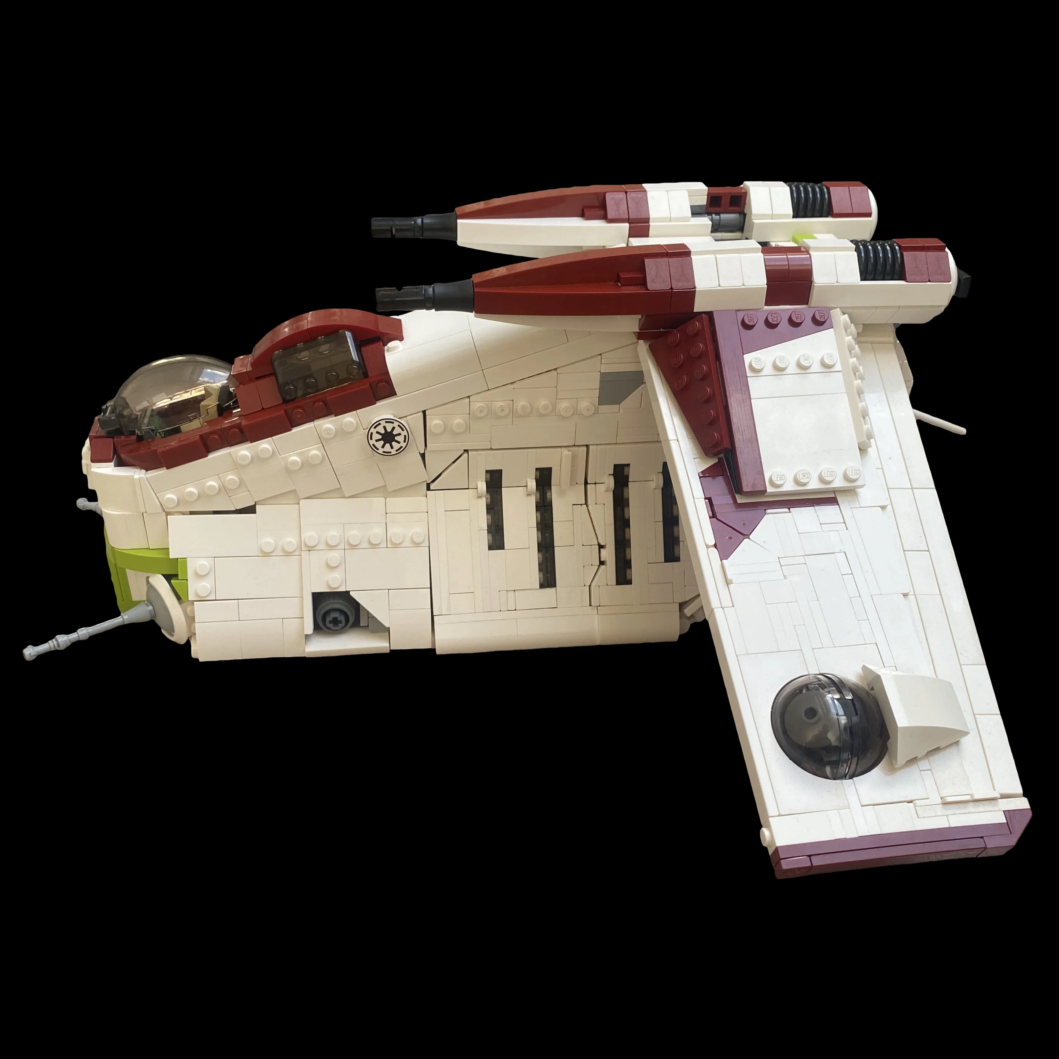 The Republic Gunship or LAAT (Low Altitude Assault Transport) can do it all. This heavily armed repulsorlift is effective in air-to-air and air-to-ground combat as well as troop/supply transport. They played a key role in nearly all atmospheric combat in the clone wars, and are among the most well recognized and beloved ships from this era in the Star Wars universe. This minifigure scale brick-build model has an excellent smooth shape. It's built strong, holds two minifigures in the cockpits, and has functioning sliding doors with considerable space in the hull.