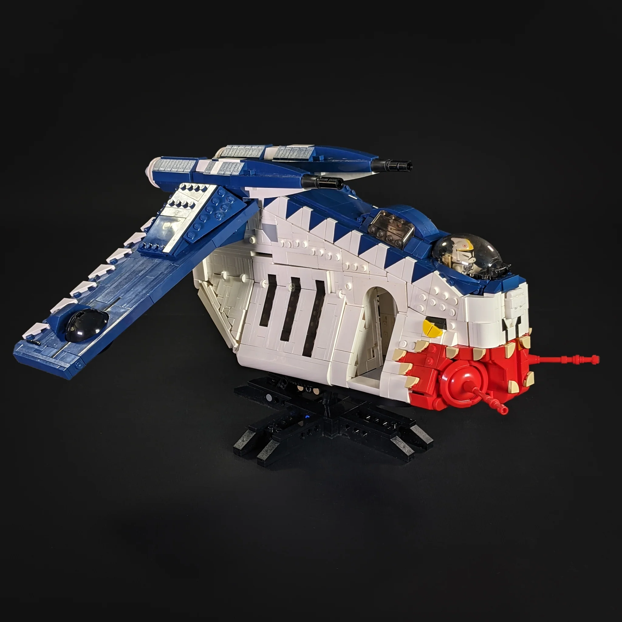 The Republic Gunship or LAAT (Low Altitude Assault Transport) can do it all. This heavily armed repulsorlift is effective in air-to-air and air-to-ground combat as well as troop/supply transport. They played a key role in nearly all atmospheric combat in the clone wars, and are among the most well recognized and beloved ships from this era in the Star Wars universe. This minifigure scale brick-build model has an excellent smooth shape. It's built strong, holds two minifigures in the cockpits, and has functioning sliding doors with considerable space in the hull.