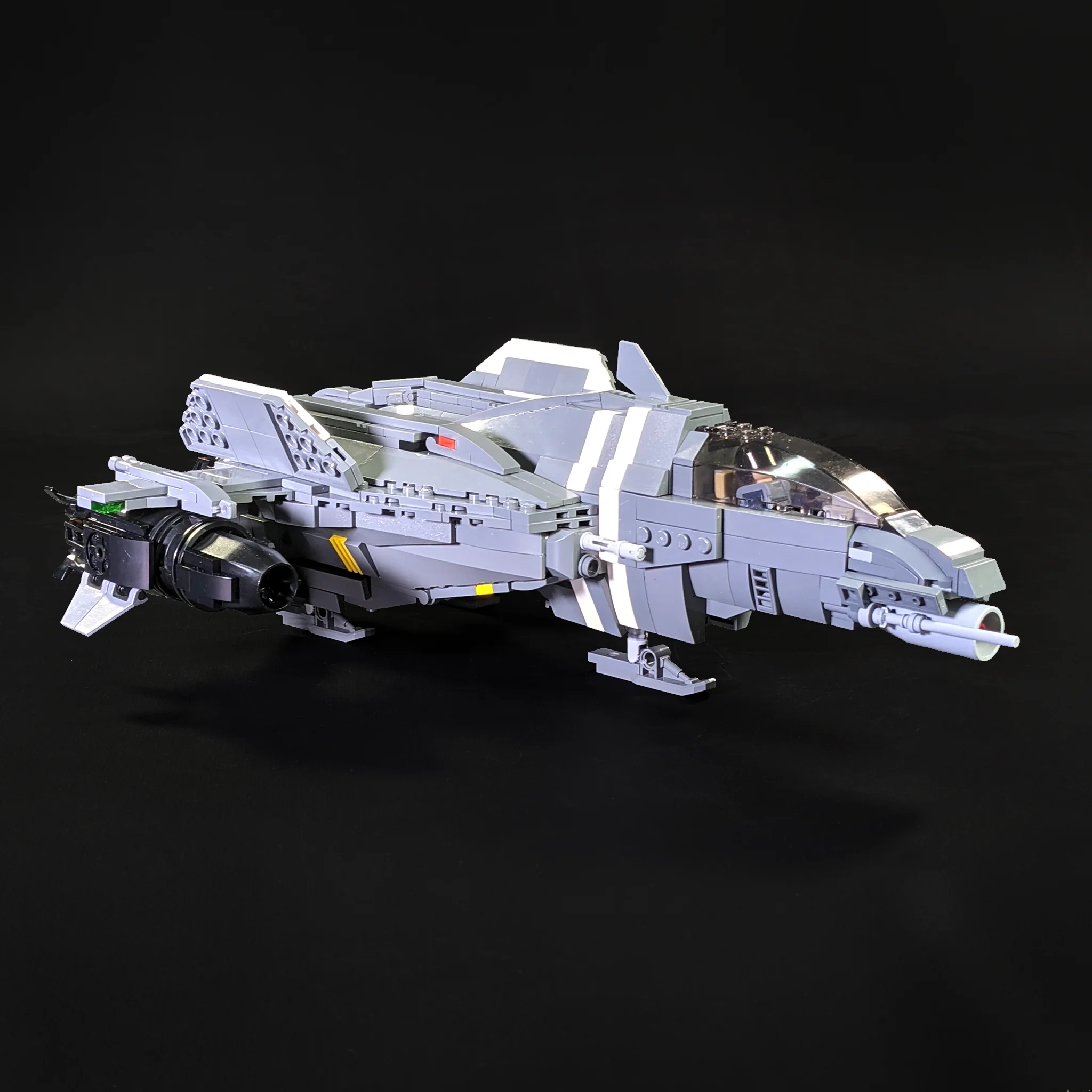 This model has an internal cockpit that seats one minifigure and has folding landing gear.