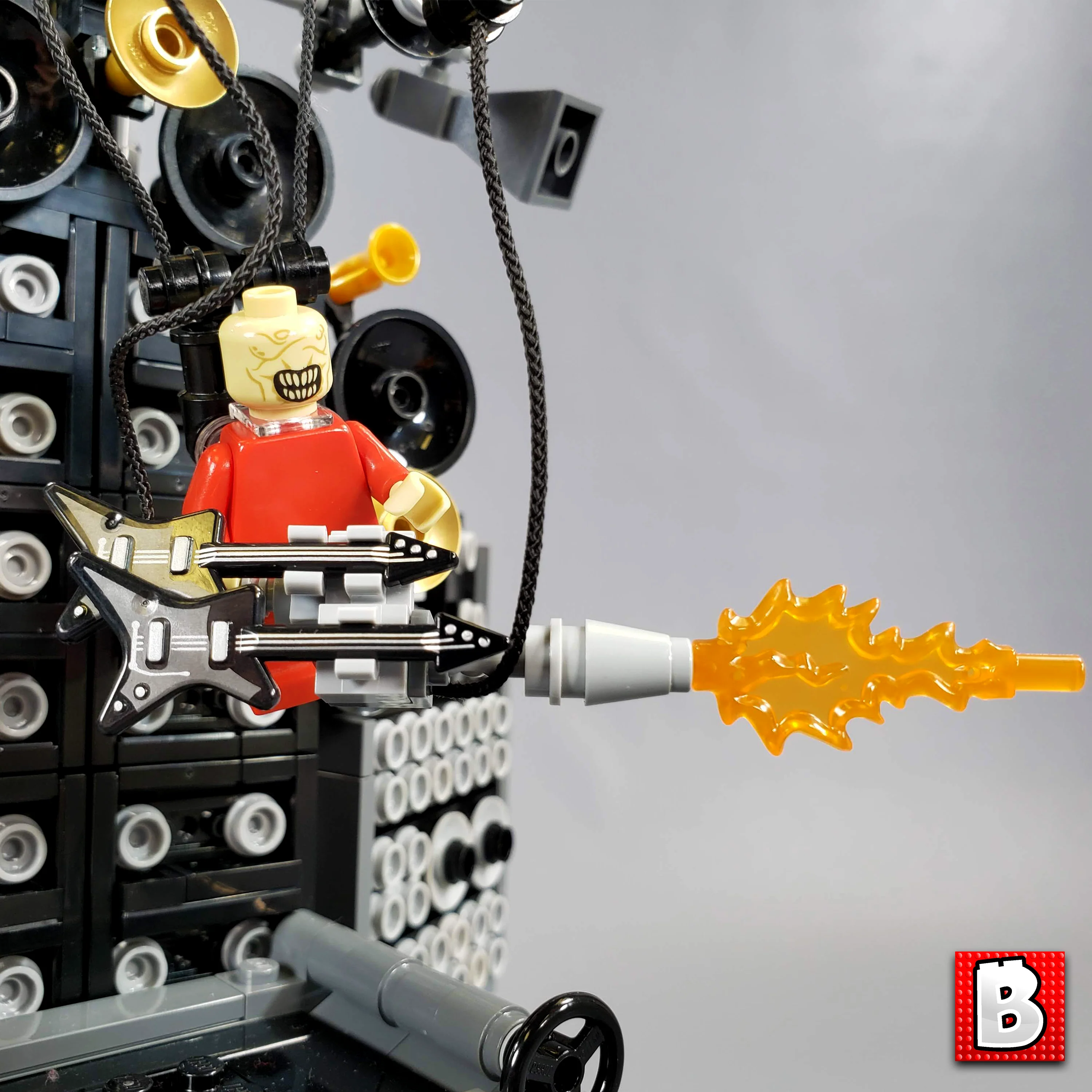 This model has interior space in the cab for a minifigure and road supplies. Hanging double-guitar/ flame-thrower for "the doof warrior"