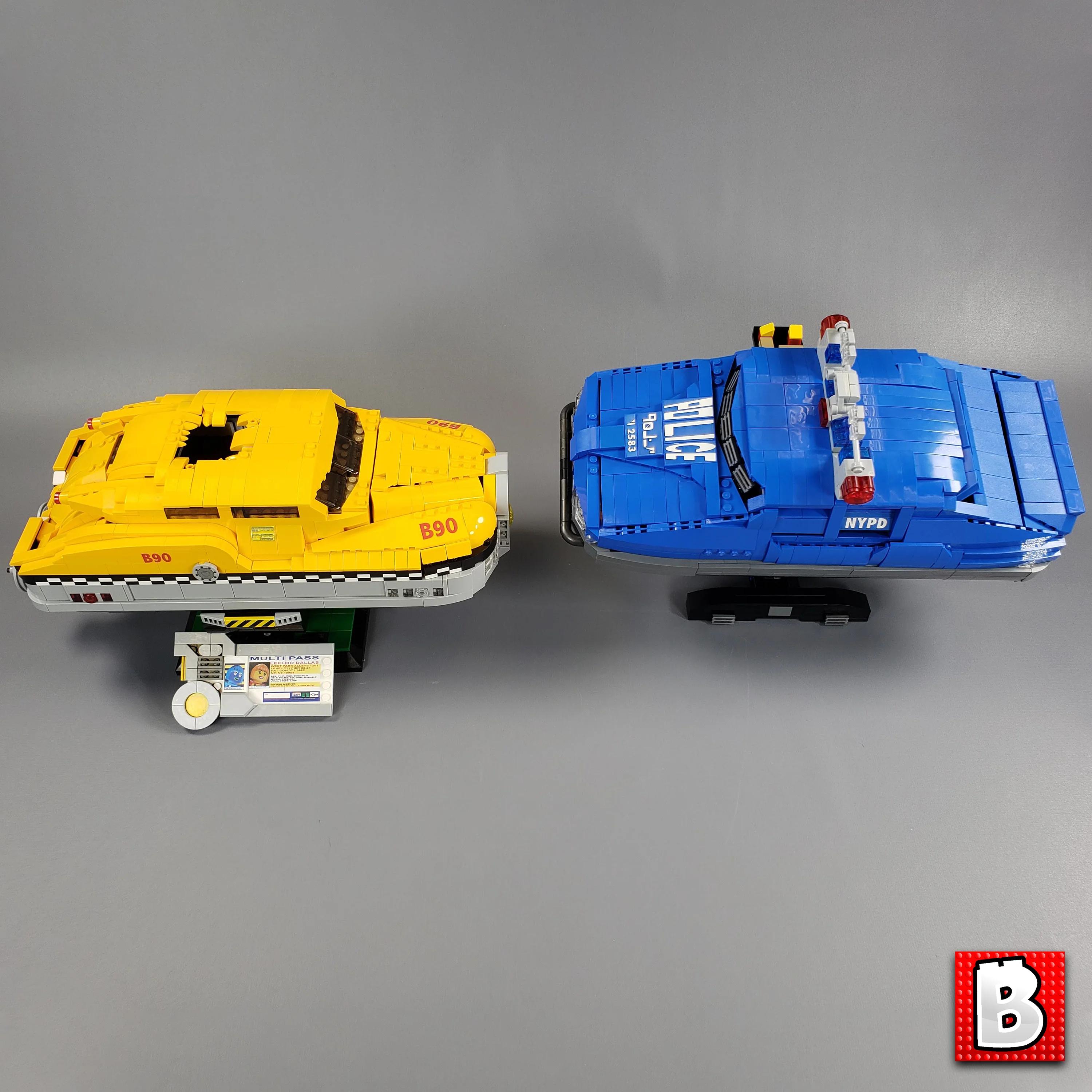 Built above minfigure scale, the Taxi and Police car have easily removable roofs with fully furnished interiors. The models are very strong, swooshable if you like, and comes with display stands as well :)