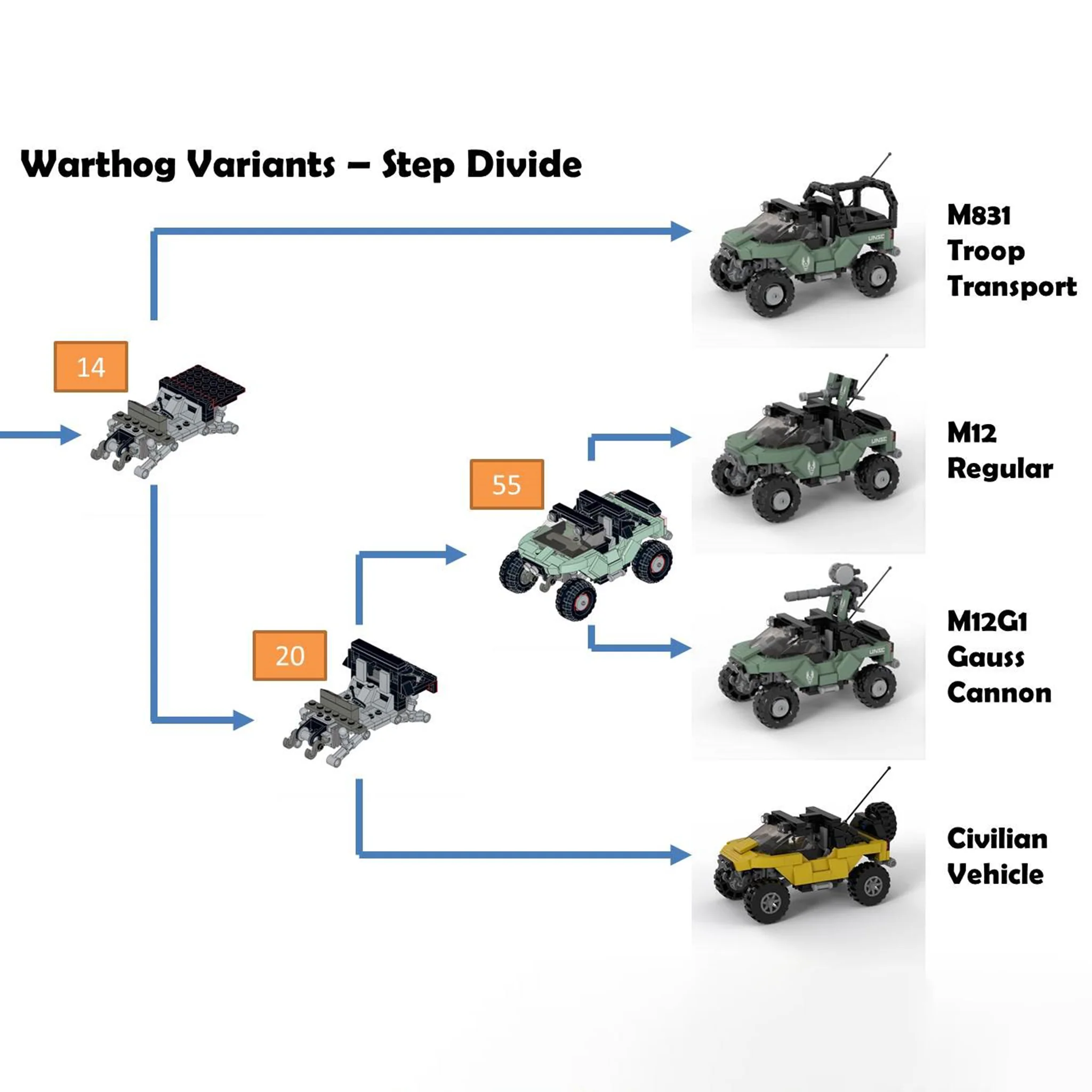 This model has a driver and passenger seat + a rotating gun at the rear to accommodate a total of three minifigures. There are also several alternate build options for the Warthog design included.