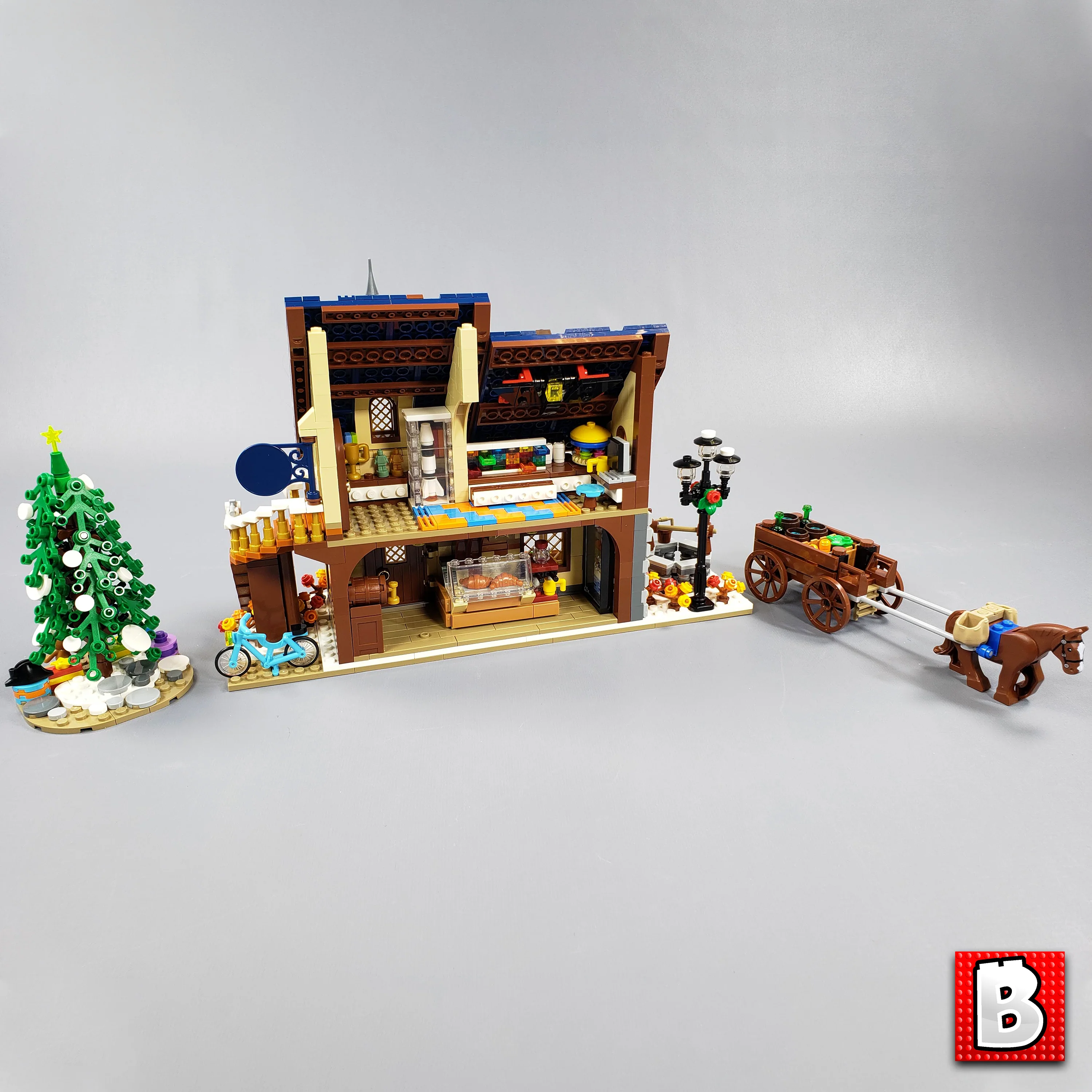 The holidays are approaching fast and your local grocers are still hard at work. The last of their fall harvest is for sale out front and the cart is loaded up ready to go to market. On the inside, our grocers have made quite a modern and comfy home. The bottom floor is a small walk-in cafe with pastries and a variety of beverages for passing travelers. Upstair is the all too familiar hobby room complete with organized bricks, a trophy shelf, and some kits you might be able to recognize :) Like so many other holiday-themed builds there is also a bushy Christmas tree and creative presents placed below.